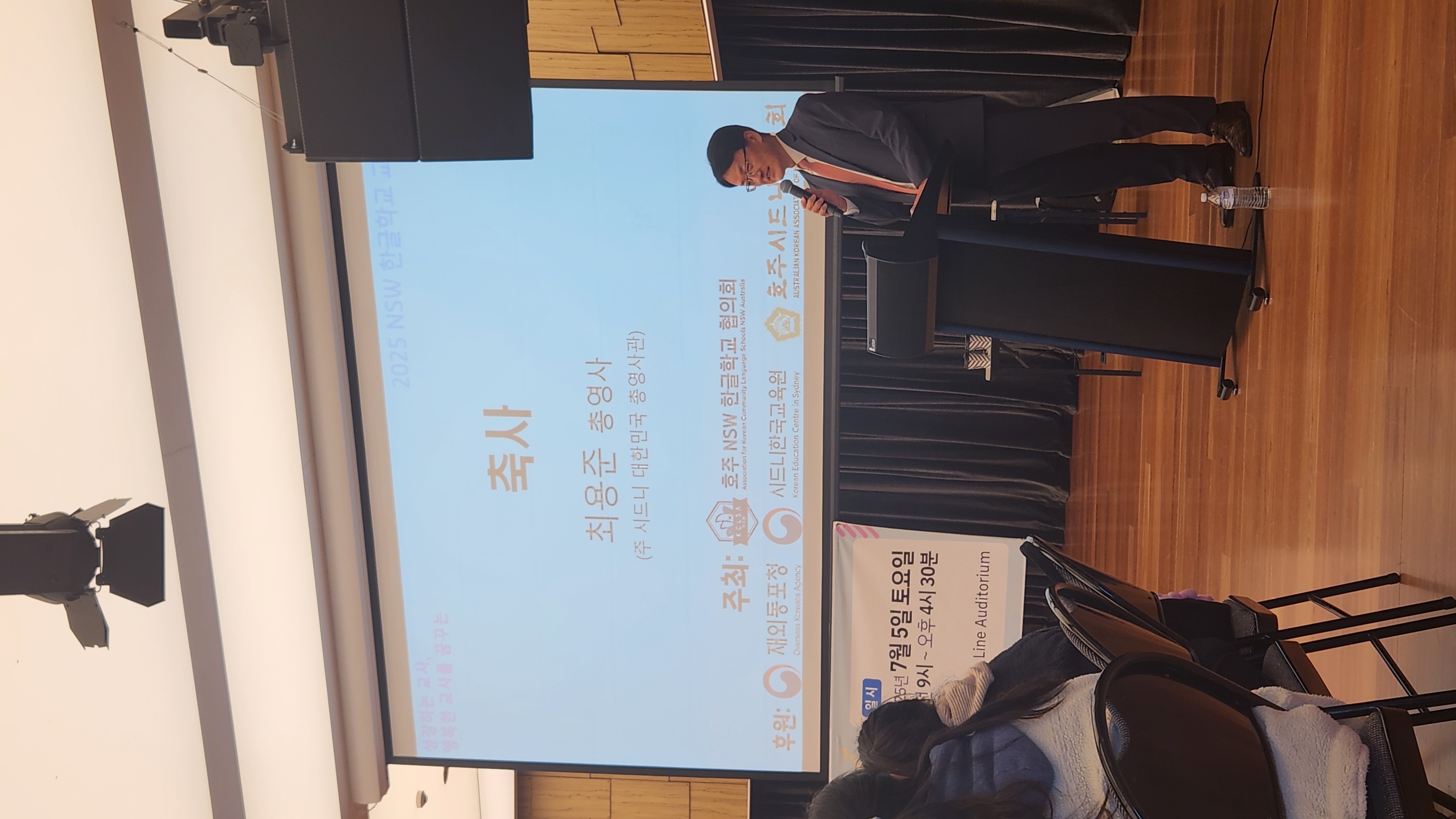 최용준 주시드니총영사는 축사에서 “한글학교는 단순한 언어 학습을 넘어, 한국인의 정체성과 세계시민으로서의 시야를 넓혀주는 소중한 배움의 장을 우리 아이들에게 제공해 주고 있다.” 라며, 한글학교 선생님들의 노고에 감사를 전했다. 이어 “선생님 한 분 한 분의 열정이 우리 아이들에게 고스란히 전해져서 우리 아이들이 한국과 호주를 잇는 다리이자 미래를 열어가는 중요한 인재로 성장하기를 기대한다.” 고 덧붙였다.